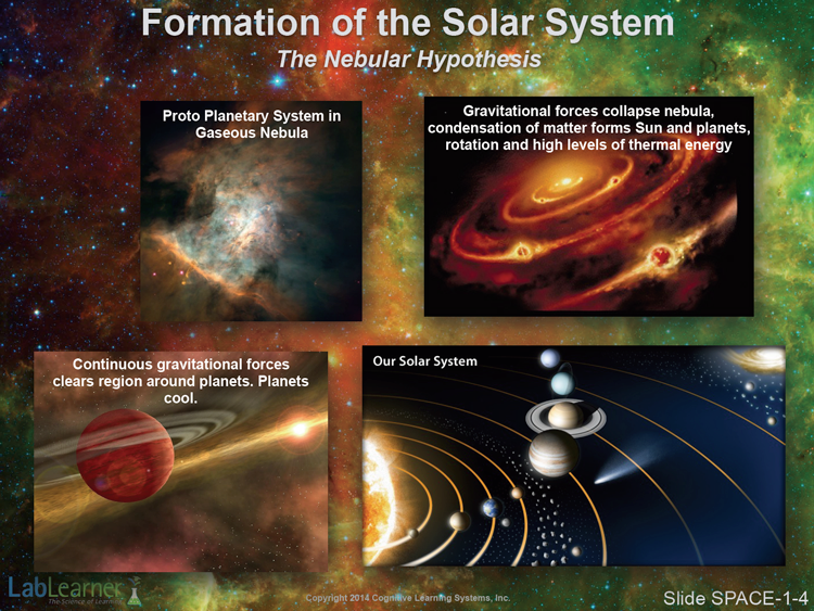 - This slide addresses a hypothesis that suggests how our Solar System (and other Solar Systems) formed. It is referred to as the Nebular Hypothesis. A nebula (upper left) is an interstellar cloud of dust, hydrogen, helium, and other gases where stars and planets form.