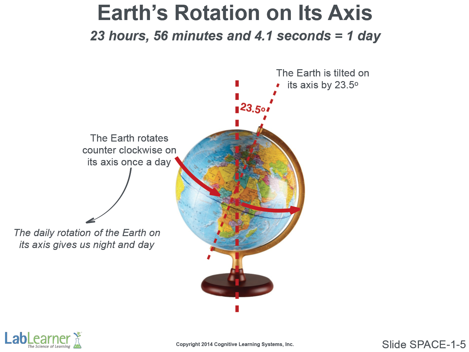 - As the Earth rotates on its axis, it constantly exposes new parts of its surface to the Sun. It is this turning in relation to the Sun that gives us night and day on Earth. Obviously, one surface of the Earth is always pointed at the Sun. It is always daylight somewhere on Earth and always nighttime somewhere on Earth at exactly the same time. The difference in hours of daylight at any location on Earth at different times of the year is a function of the 23.5o tilt of the Earth on its axis, as are our seasons.