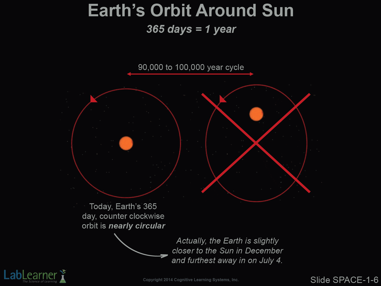 - However, as shown on the left of this slide, the Earth’s orbit around the Sun is very nearly circular. As shown, the degree of orbital “eccentricity” varies quite a bit on a 90,000 to 100,000-year cycle. Today, the Earth’s orbit around the Sun is about 6% off from being perfectly circular.