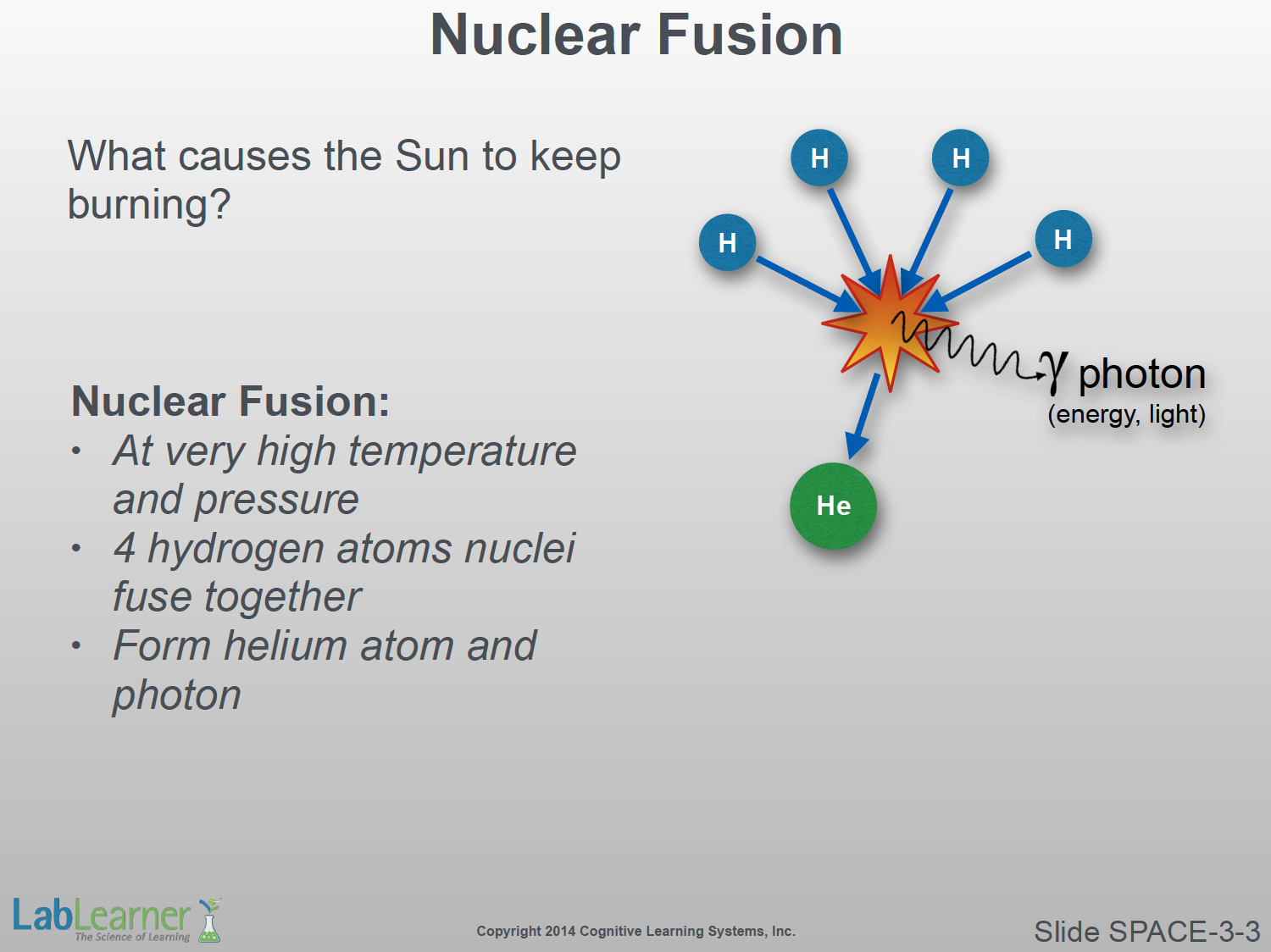 - Since hydrogen atoms are composed of a single proton in their nuclei, sometimes they are simply referred to as “protons” and so the Sun’s nuclear fusion reaction is sometimes called proton-proton fusion. The reaction we show here is somewhat oversimplified as it omits some intermediate steps in the proton-proton fusion reaction but it is detailed enough for most sixth-grade students. We will return to it in greater detail when we study the CELLs Light and Photosynthesis in grade 8.