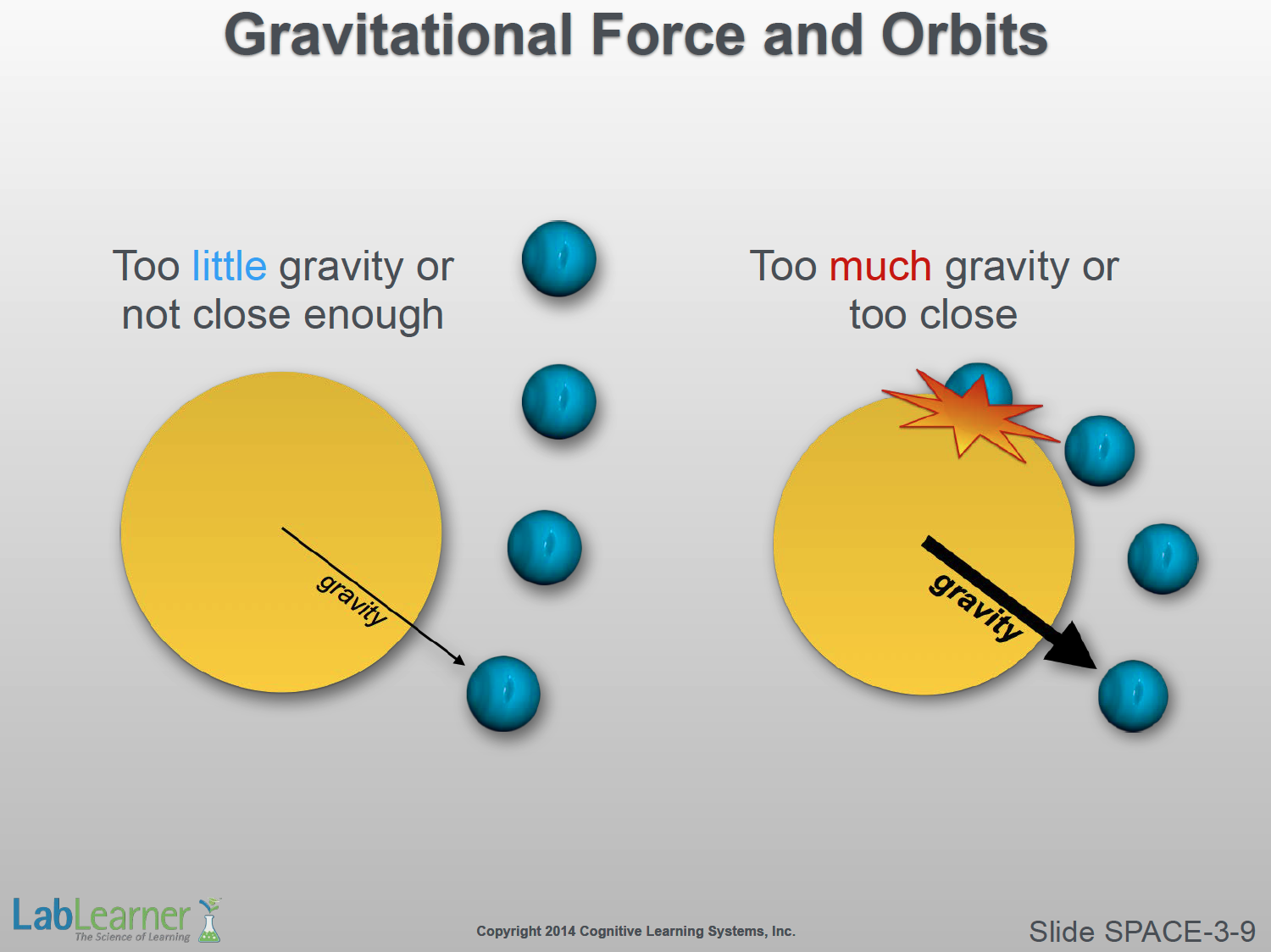 - This final slide simply shows the circumstances that must be overcome to arrive at a sustained orbit. In the illustration to the left of this slide, the gravitational force of the star is not enough to pull the planet into orbit. This may be because the star is not large/massive enough to exert enough gravitational force on the planet, or because the planet is not passing close enough to the star. Notice, however, that passing so near to the star has nonetheless changed the planet’s trajectory or path. The planet will continue on from here in a straight line and at the same velocity forever unless another external force acts upon it.