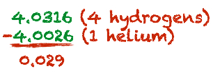 - According to the Periodic Table, hydrogen has a molecular mass of 1.0079. Since 4 hydrogen atoms are involved in the fusion reaction, we multiply this number by 4 and get an atomic mass of 4.0316. The helium atom has a molecular mass of 4.0026 according to the Periodic Table. So, 4 hydrogen atoms with a total mass of 4.0316 are converted to a single helium atom with a mass of 4.0026. This leads to the simple subtraction shown on the lower left side of the slide: