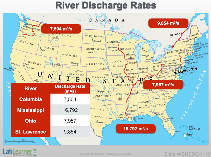 - Finally, notice that the Columbia has by no means the largest discharge rate of the selected rivers shown on this slide. The Mississippi River, for example, discharges over twice this volume of water per second into the Gulf of Mexico.