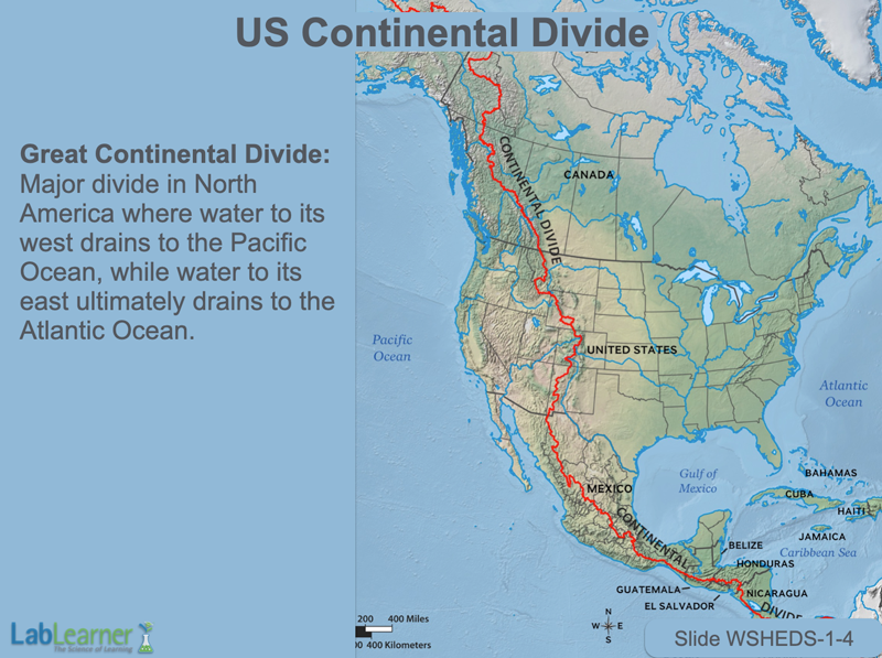 - We can also see from this slide that there are continental divides on every continent on planet Earth. In South America, the Great Continental Divide that runs south from Alaska continues to the southern tip of Chile. Water to the east drains into the Atlantic Ocean, water to the west drains into the Pacific Ocean through the massive Amazon watershed.