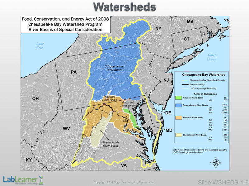 - As mentioned earlier, smaller watersheds often conjoin to form larger drainage systems. This slide depicts the Chesapeake Bay watershed, which extends as far north as south-central New York State and drains much of Pennsylvania, Maryland, Washington DC, part of Delaware, northern and central Virginia, and a small part of eastern West Virginia. All of the water drained from this vast area eventually reaches the Chesapeake Bay before moving south and into the Atlantic Ocean.