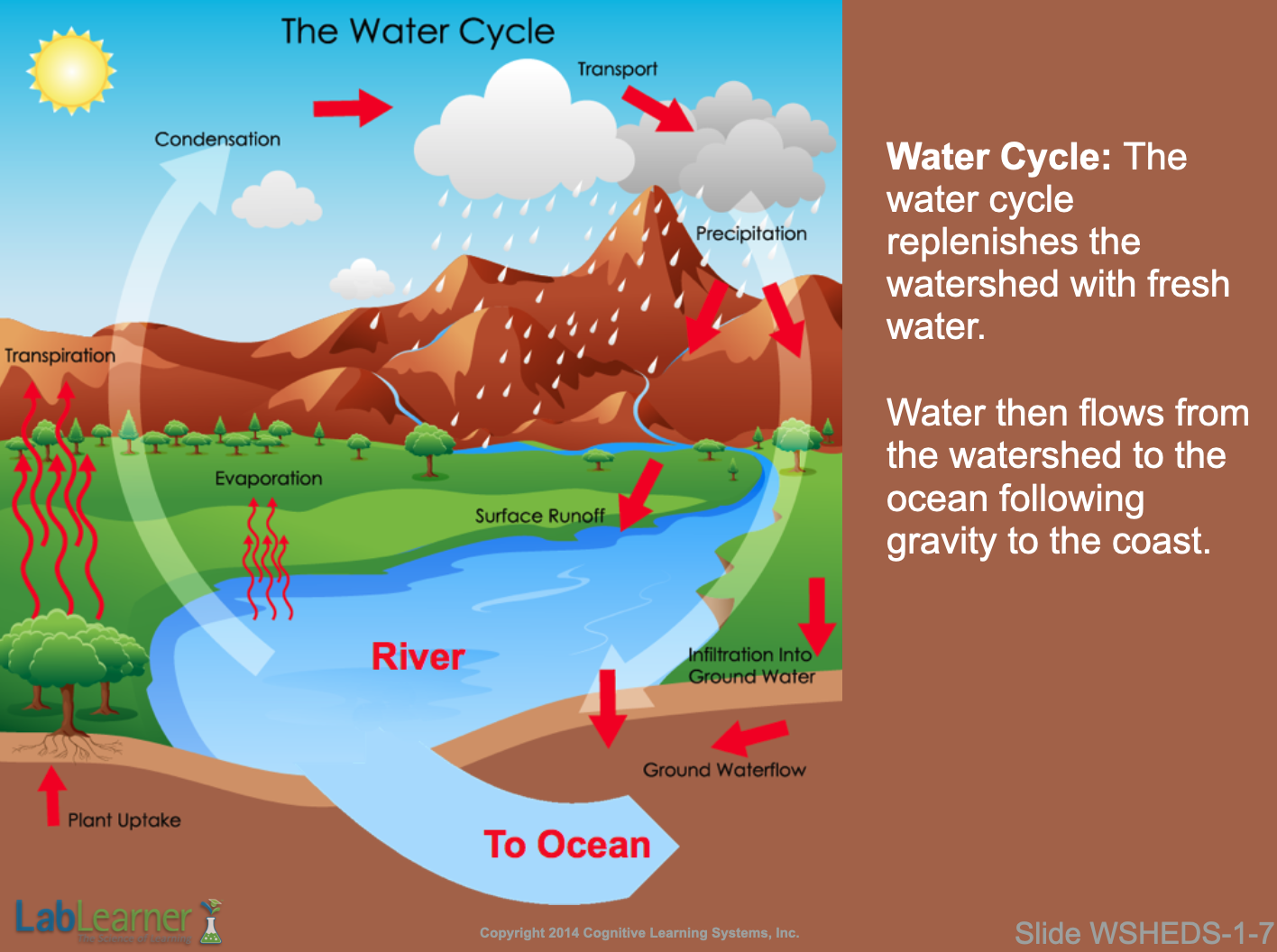 Note: This slide depicts the water cycle, a concept that LabLearner students should be quite familiar with but is worth reviewing in this context. While we could start anywhere in the cycle, let’s begin with precipitation at the upper right.