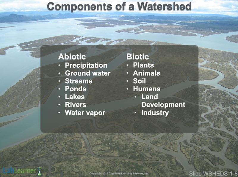 - This slide lists some of the many components found in watersheds. It is, of course, only a partial list. On the left, the abiotic (non-living) components simply include the various forms of water in the watershed. These include precipitation, groundwater, streams, ponds, lakes, and rivers. Notice that water vapor is included as well and recall its role in the water cycle.