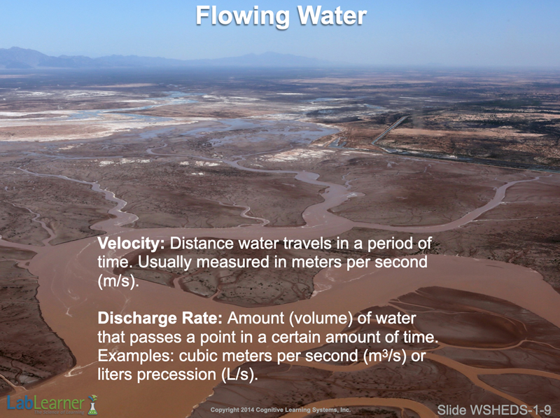 - The last two slides focus on the dynamics of moving water. As shown here, the velocity of water is the distance water travels in a certain period of time. As might be expected, surface runoff is likely to move with greater velocity on a steep, hard slope than on a gentle slope with soft, absorbent soil.