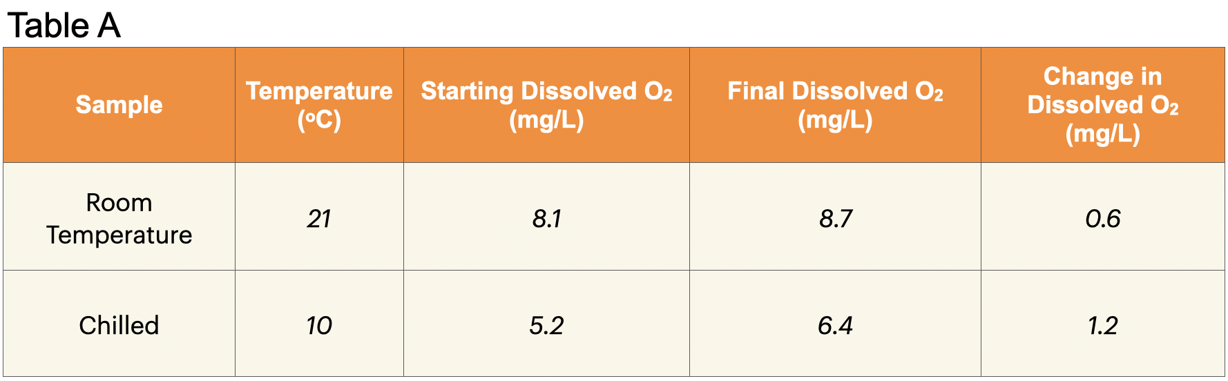 17. Record: Write the change in dissolved oxygen concentration in the final column of Table A.