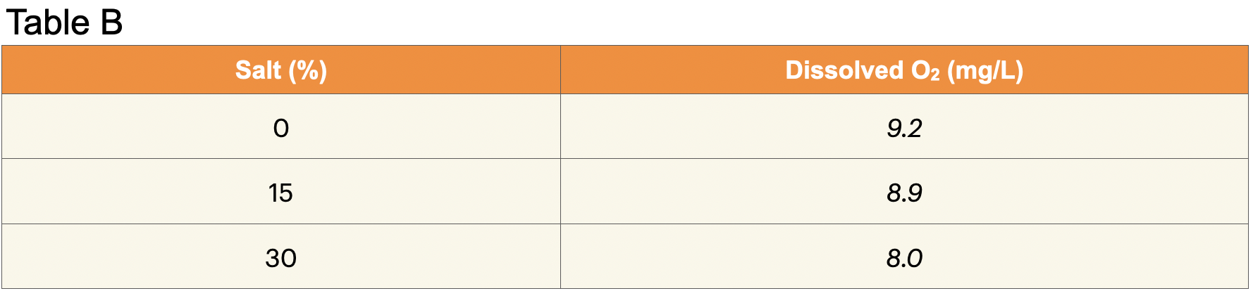9. Record: Write the average dissolved oxygen concentration for the 30% salt solution in Table B.