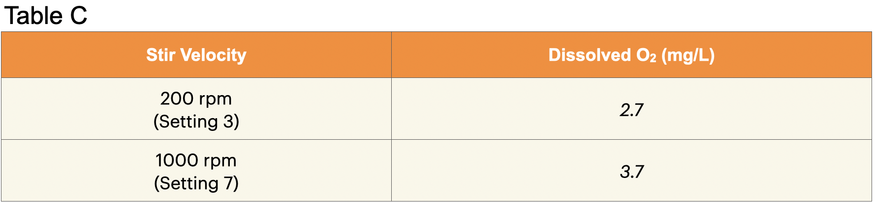 E. Record: Write the average dissolved oxygen concentration for 200 rpm (Setting 3) in Table C.